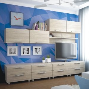 - Зона зберігання. Дана частина обстановки вітальні складається з стелажів, стінки, шаф і ящиків.